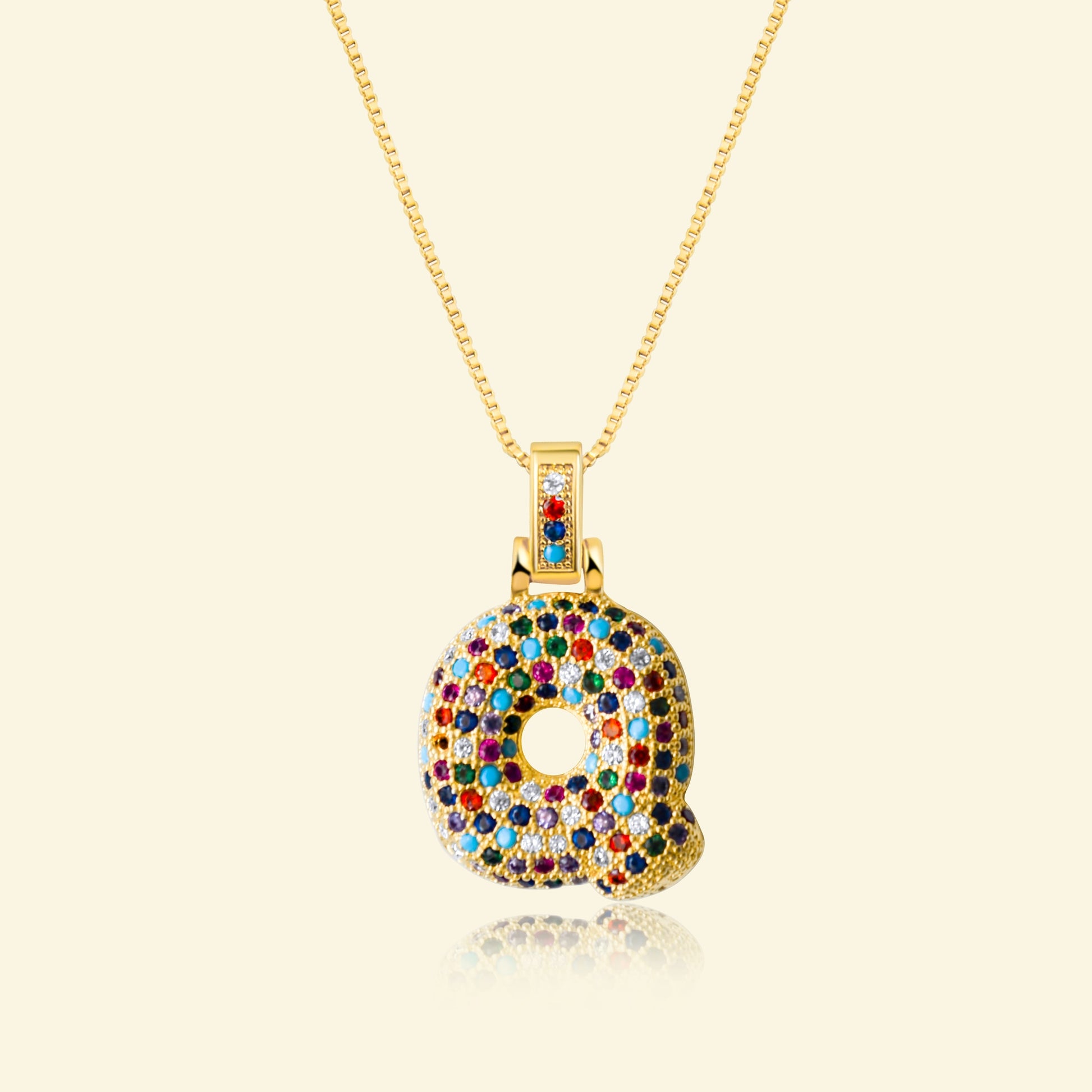 This gold-plated bubble letter is embellished with tiny multicolored stones designed to reflect a ton of light, creating a playful pendant that adds a heavy dose of fun to any outfit.