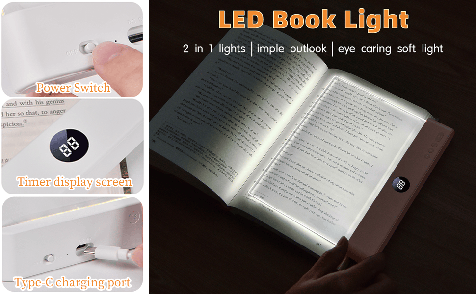 - Dimmable & Timer: Flat book light features a stepless dimming function, you can effortlessly adjust the brightness to suit any lighting situation. And it with a timer countdown LED digital screen, you can set your reading time from 1 - 99 minutes. Once the set time is up, this in bed reading light automatically turns off. It's an ideal feature for those who often lose track of time while reading, preventing late night reading from disturbing your sleep